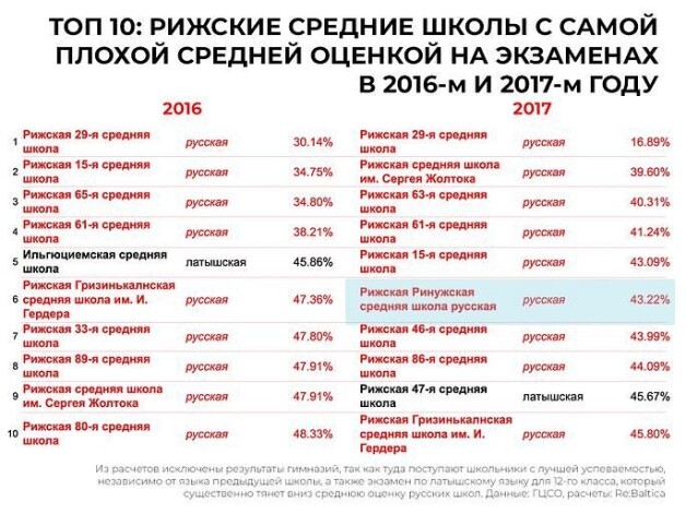 Почему в Риге самые плохие по успеваемости школы – именно русские, таким вопросом задалась журналист Инга Сприньге, которая с Балтийским центром журналистских расследований Re:Baltica провела исследование на эту тему. Во внимание брались школы Риги с самой плохой средней оценкой на централизованных экзаменах в течение нескольких лет, сообщает Dienas Bizness.