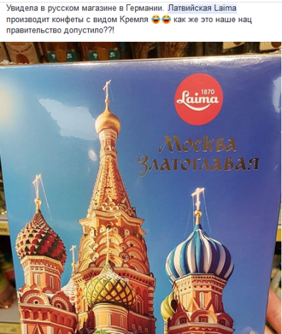 «Увидела в русском магазине в Германии. Латвийская Laima производит конфеты с видом Кремля, как же это наше нац правительство допустило??!» - задалась вопросом автор поста. По свидетельствам комментаторов, в Германии подобная коробка конфет стоит 4,55 евро, в то время как в Латвии – 7 евро.