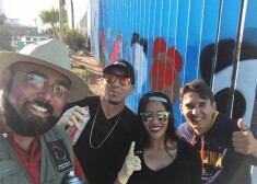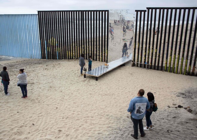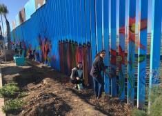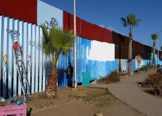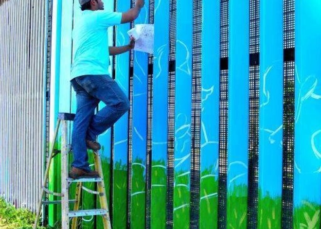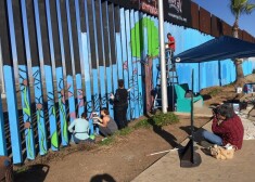 Люди разрисовывают стену, отделяющую Мексику от США