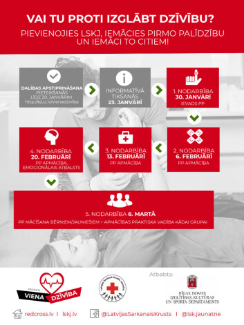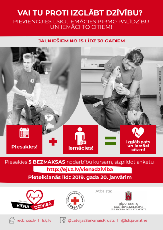 Латвийский Красный Крест (LSK) приглашает рижскую молодежь в возрасте от 15 до 30 лет подать заявку на участие в проекте «ОДНА ЖИЗНЬ», цель которого – дать возможность молодым людям бесплатно овладеть основами первой помощи под руководством сертифицированных преподавателей и узнать, как правильно обучить этому своих сверстников.