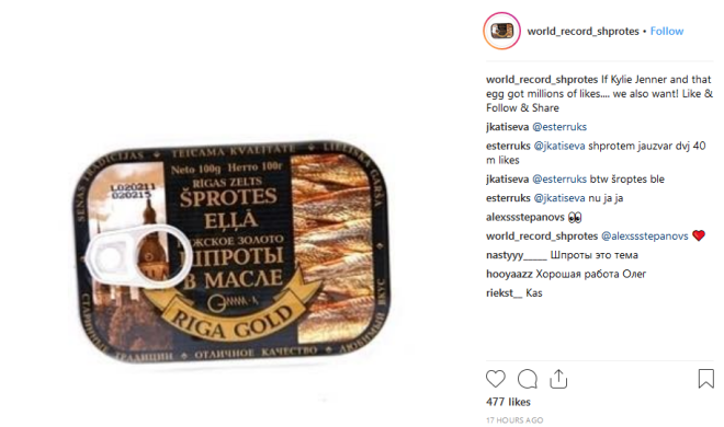 Рижские шпроты решили не отставать от модных тенденций публикаций в социальных сетях и привлечь к себе внимание в Instagram. Пост от @world_record_shprotes претендует на статус самого популярного в Латвии.