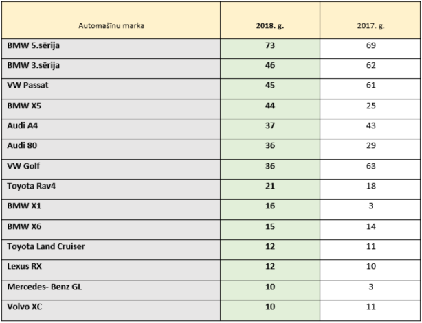 В 2018 году в Латвии больше всего угоняли машины марки BMW, далее в порядке убывания следуют Volkswagen, Audi, Toyota, Mercedes-Benz, Volvo, Opel, Lexus, Nissan, Mazdа.