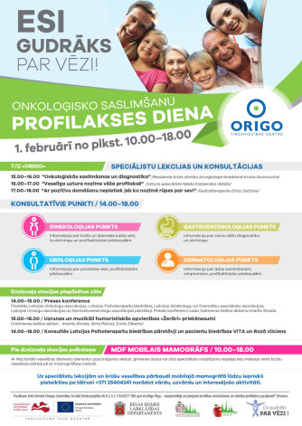 Также в торговом центре «Origo» с 15:00 до 18:00 будут проходить тематические лекции, в рамках которых об онкологических заболеваниях и диагностике расскажет врач Криста Арцимовича, а про значение здорового рациона при профилактике рака будет говорить специалист-диетолог Нелда Карпенска-Аллажа. Гештальт-терапевт Элина Зелчане обратит внимание на то, почему позитивного мышления для онкологической профилактики недостаточно и пригласит поучаствовать в дискуссии на тему значения настоящего ухода за собой и своим здоровьем.