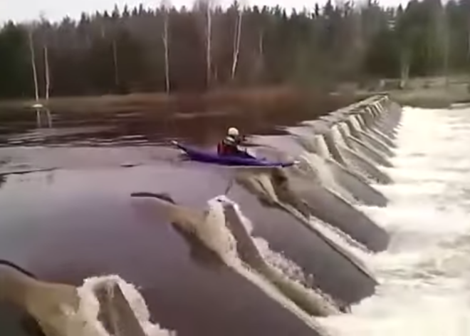 "Я думал, что будет страшнее, честно говоря", — признается автор записи после того, как каякер быстро преодолевает гидросооружение и начинает отплывать в сторону.