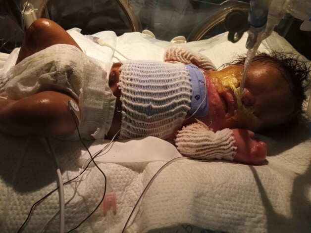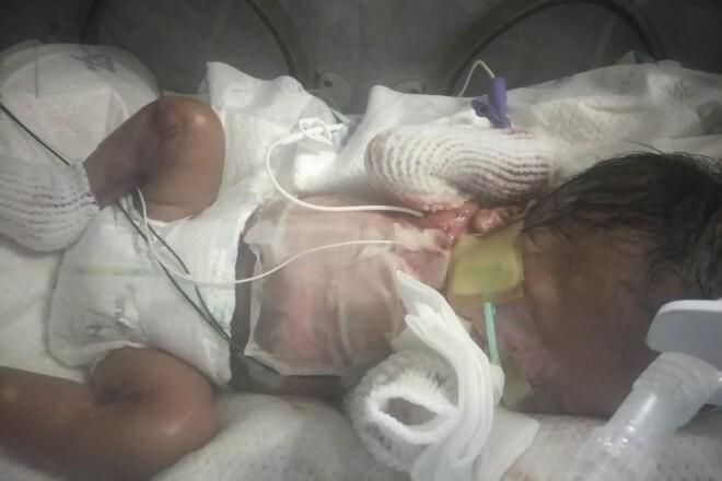 Кожа новорожденного была лишь на голове и частично ногах, но шея, торс, живот и обе руки выглядели словно куски сырого мяса, а пальцы на руках были сросшимися, пишет The Sun.