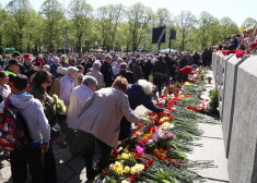 Сегодня утром несколько сотен человек возложили цветы к памятнику освободителям Риги в парке Победы в честь 74-й годовщины разгрома нацизма.