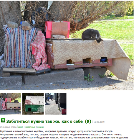 «Считаю это ненормальным. Если хотите заботиться о кошках, обустройте место на земле своего дома. Ухаживайте и следите, – говорит начальник отдела. – Чтобы не было такого: приду, брошу рыбьи головы и буду гордиться заботой о животных. Если берете ответственность на себя, то делайте это на таком уровне, на каком заботитесь сами о себе. Думаю, что по поводу аккуратного, ухоженного домика и у других жильцов не будет никаких претензий».