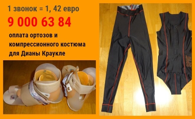 Сейчас Диане очень нужны специальная компрессионная одежда «SPIO» и ортозы «DAFO» для ступней ног. Врачи настоятельно рекомендуют и уверены, что это поможет улучшить ситуацию. Заказывать их нужно в Германии по индивидуальным меркам. Компрессионная одежда и ортозы стоят 5500 евро (включая расходы на дорогу). Таких денег в семье нет.