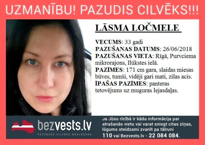 33-летняя Ласма Лочмеле, уроженка Сигулды, пропала в конце июня 2018 года в Риге, сообщает организация по поиску пропавших bezvests.lv.