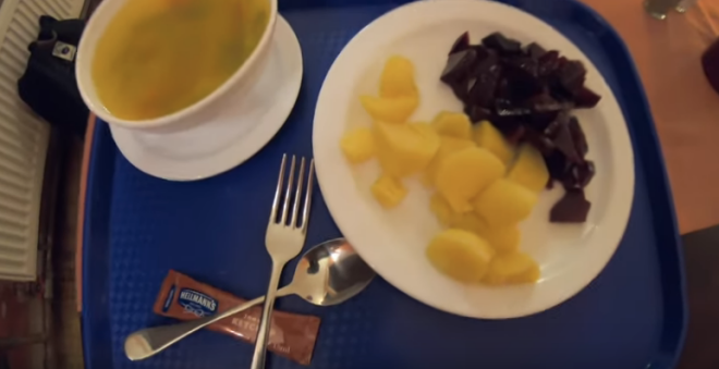 Выбор Мартиньша пал на вареный картофель в комплекте со свеклой. Плюс немного кетчупа на картофель. Еще он купил простой овощный суп, в котором, как видно на видео, не плавали даже капли масляного жира, так что он был действительно диетический. Суп блогеру понравился, но свекла была довольно "паршивая", потому что этот овощ обычно не так плох на вкус, сделал выводы парень.