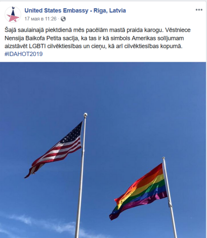 «Посольство США в Риге 17 мая отметило Международный день борьбы с гомофобией, трансфобией и бифобией (IDAHOT) со своими международными партнерами и друзьями, НГО и публичными должностными лицами — чтобы привлечь внимание к нарушения прав человека и дискриминации, направленной против членов ЛГБТ-сообщества во всем мире. Мы принципиально не обсуждаем обстоятельства, связанные с внутренними процедурами [внешнеполитической службы США]. Посольство гордится тем, что поддерживает равные права человека для всех групп независимо от пола, расы, религии, этнической принадлежности или сексуальной ориентации», — гласит полученный Rus.Lsm.lv комментарий от посольства США в Латвии.
