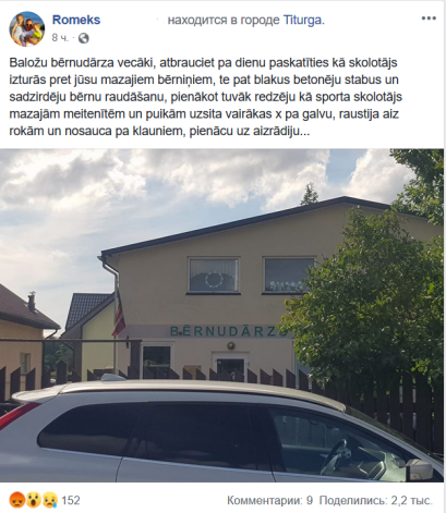 "Родители детского сада в Баложи, приезжайте днем посмотреть, как учитель относится к вашим маленьким детишкам. Рядом бетонировал столб и услышал детский плач, подошел ближе, увидел, как учитель спорта маленьких девочек и мальчиков бьет по голове, дергает за руки и называет клоунами. Подошел и сделал замечание", - пишет Ромекс.