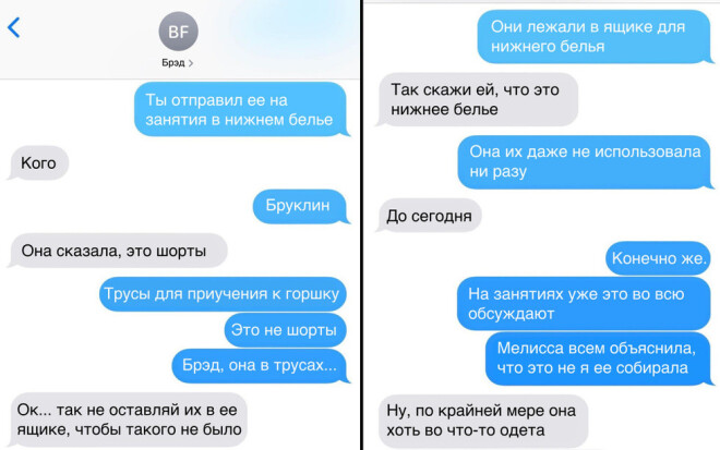 На этой неделе Элайза Фридлендер, мама трехлетней Бруклин, была вынуждена отправиться на работу пораньше. Поэтому все обязанности по сбору детей легли на ее мужа. Брэд с легкостью справился с задачей, о чем написал своей возлюбленной в СМС: "Уже приготовил омлет для девочек и готовимся к выходу".