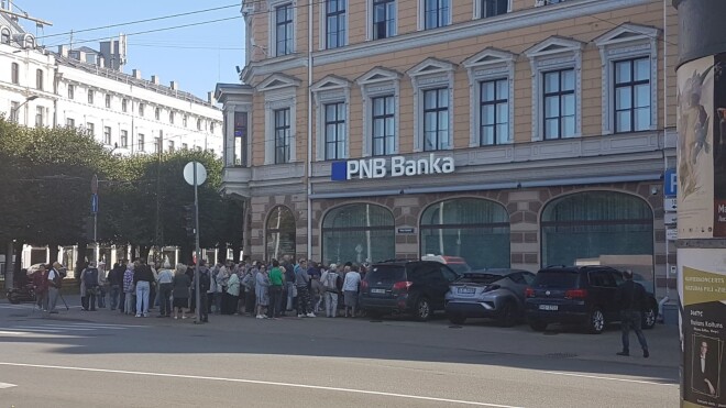 Люди в очереди у филиалов PNB banka в Даугавпилсе и Риге 22 августа 2019 года