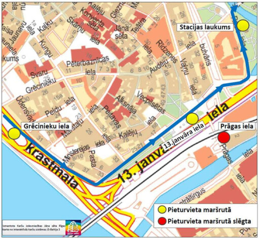 Весь день трамваи 1-го маршрута в направлении конечного пункта "Югла" или "5-е депо" (ул. Бривибас) доедут по маршруту до остановки "улица Грециниеку", далее по набережной 11-го ноября, ул. 13 января, ул. Радио и далее по обычному маршруту. На маршруте будет закрыта "улица Прагас", трамвай возьмет пассажиров на остановке "ул. 13 января".