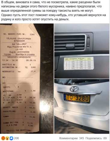 Пользовательница Facebook Нина в группе "Говнорынок", посвященной некачественным товарам и недобросовестным услугам, что уже не живет в Латвии и забыла, как тут дела делаются, поэтому после ночного рейса не глядя взяла такси и за поездку в центр Юрмалы заплатила вовсе не ожидаемые 30 евро.