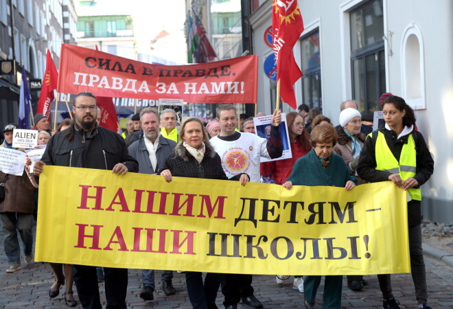 Участники шествия держали в руках плакаты с надписями на латышском, английском и русском языках: "Школьные реформы = этногеноцид?", "Остановите катастрофу образования на русском языке в Латвии", "Русским детям - образование на родном языке!", "Фашизм в Латвии - катастрофа для всех нас!", "Сохраним школу - сохраним язык!" и др.