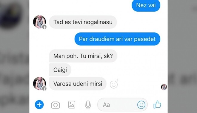 Жительница Айзкраукле - одна из тех, кто получал такие угрозы. Опасаясь за свою безопасность и безопасность своих детей, женщина хочет остаться анонимным. Женщина при общении с другими представительницами прекрасного пола поняла, что мужчина по имени Ингус в социальной сети обратился примерно к 30 женщинам. Изначально незнакомец лет 30-ти в переписке предлагал познакомиться, но, получив отказ, угрожал молодым женщинам жестокой расправой. Все это осталось на скриншотах переписок.