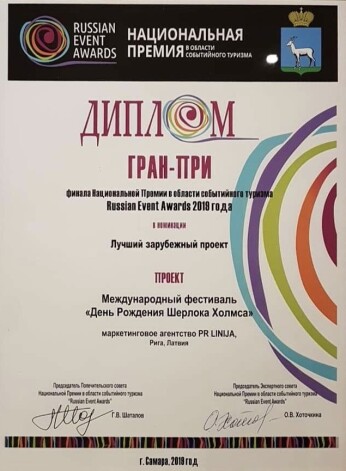 17 ноября состоялся финал VIII Национальной премии в области событийного туризма Russian Event Awards 2019. Праздник «День рождения ШерлокаХолмса», который с 2012 года ежегодно проходит в Риге, получил главный приз в номинации «Лучший зарубежный проект».