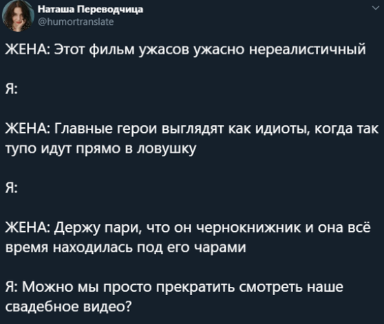 В детстве родители говорили мне, что мужикам нужно только одно, и чтоб я была осторожнее. Ну, вот мне 28 — и выясняется, что мужикам нужно только поспать, посмотреть YouTube и поесть, а «только одно» надо чисто мне...