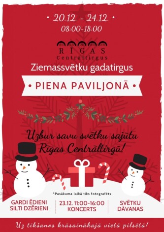 C 20 до 24 декабря (с 08:00 до 18:00) Молочный павильон Рижского Центрального рынка превратится в рождественский городок под крышей. Здесь соберутся десятки торговцев из Латвии и соседних стран, предлагая покупателям приобрести самые разные продукты для праздничного стола и, конечно же, подарки.