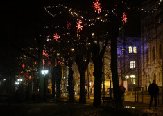 А еловые композиции, размещённые на бинарных столбах на Ратушной площади, дополняют гирлянды лампочек тёплого белого света.