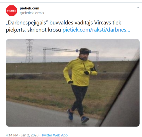 Чудесное исцеление на Рождество или фиктивное получение листа нетрудоспособности и обман пособия по болезни? Каковы наиболее достоверные пояснения к фотографиям, на которых руководитель строительной управы Риги Ингус Вирцавс зафиксирован 24 декабря бегущим несколько километров в Саласпилсе и округе? Официально Вирцавс считается нетрудоспособным уже с 3 декабря, пишет журналист Лато Лапса на портале pietiek.com.