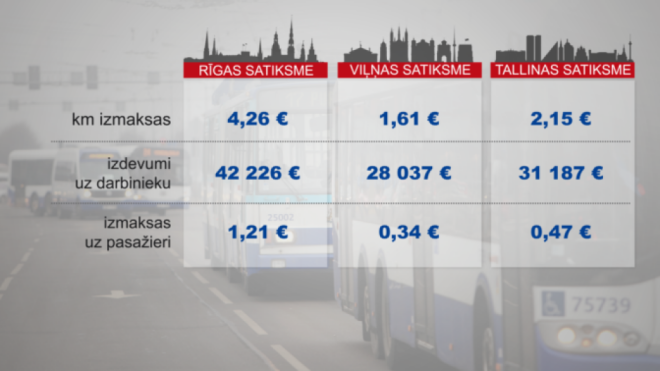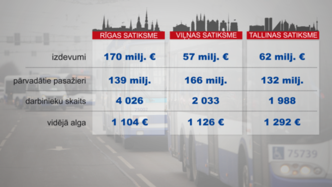 Публично доступные данные действительно являются неадекватными. В год Rīgas satiksme тратит 170 млн евро и перевозит 139 млн пассажиров, в Вильнюсе – за 57 млн пассажиров перевозит 166 млн пассажиров, а таллинское сообщение – за 62 млн - 132 млн пассажиров. Кроме того, в Rīgas satiksmе больше работников, чем в Вильнюсе или Таллине, а также зарплата для рижан ниже, чем у соседей.