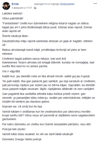 Женщина по имени Эвита писала на Facebook, что в Риге, около Ботанического сада, улиц Элвирас и Кудрас оставляют мясо и колбасу, начиненные стеклом и гвоздями, чтобы животные съели и умерли.
