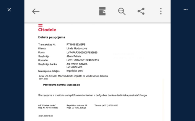 В основе мошенничества лежит фальшивое платежное поручение банка Citadele, но не исключено, что мошенники могут это сделать и с документами других банков.