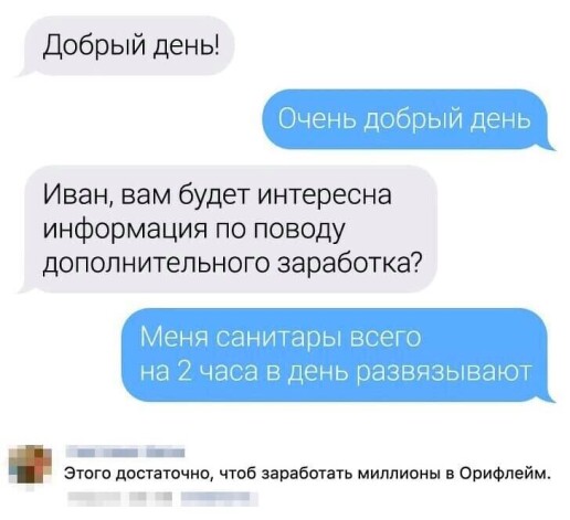 Объявление на подъезде: «В связи с работами в вашем доме на неделю будет отключена горячая вода. За отдельную плату можем отключить воду и в соседнем доме, чтобы вам не было так обидно».