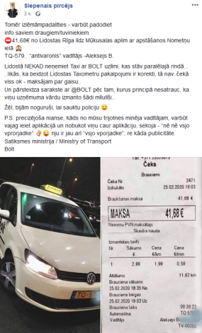 Неприятное удивление пережили латвийцы, когда решили поехать на такси от аэропорта на улицы Мукусалас с остановкой на улице Нометню. Обошлось им это в 41, 68 евро. Пассажиры поделились предупреждением в группе Slepenais pircējs на Facebook. Они считают, что заплатили за воздух, хотя в чеке все правильно. Усталость не позволила им вызвать полицию, чтобы разбираться, однако пассажиров удивила как переписка с компанией Bolt об использовании имени фирмы этим таксистом, так и то, что на вопрос водителю, не нужно ли им вызвать машину через приложение, тот ответил, что не надо, все будет хорошо.