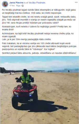 В нем Плявиньш выражает свою позицию о том, как ответственные учреждения страны реагируют на пандемию, а также весьма презрительно и унижающе высказывается о полицейском, который выполнял свои обязанности: