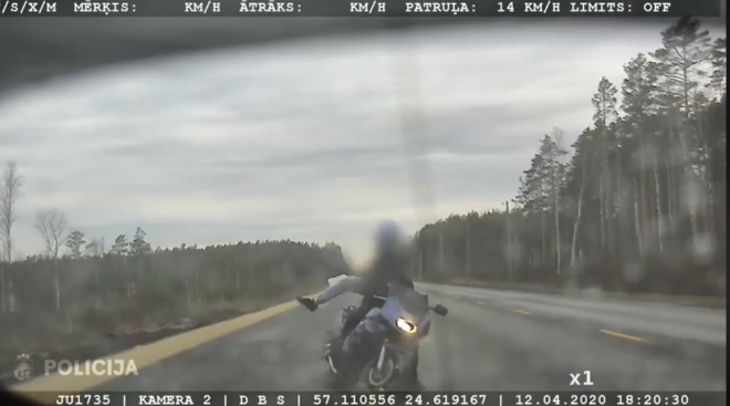 На пасхальные выходные, 12 апреля, сотрудники отдела специальных задач Государственной полиции, патрулируя на нетрафарированной машине, заметили на Видземском шоссе мотоцикл, не имеющий государственных регистрационных номерных знаков. Было решено его остановить, но он начал побег. Когда инспекторы все же остановили нарушителя, то констатировали, что он находится в розыск за преступные деяния.