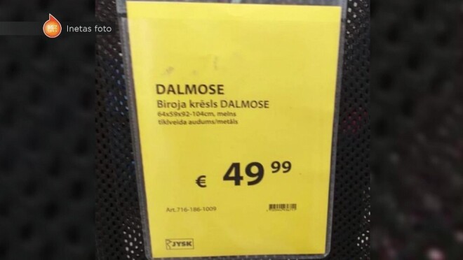 В торговом центре Domina выбранный стул стоил 49,99 евро, идентичный стул в торговом центре Spice Home, тоже в магазине Jysk, уже обошелся бы на 30 евро дороже. Инета недоумевает, почему цены на стул так отличаются. Руководство магазина ей письменно ответило, что работник ошибся, 49,99 евро – это цена по акции, которую напечатали не на том цвете, не на красном, который указывает на скидку. Инета подозревает искусственное повышение цены, учитывая, что в магазинах - приток родителей, которые ищут для детей все необходимое для школы.