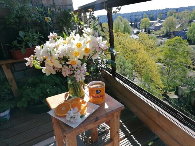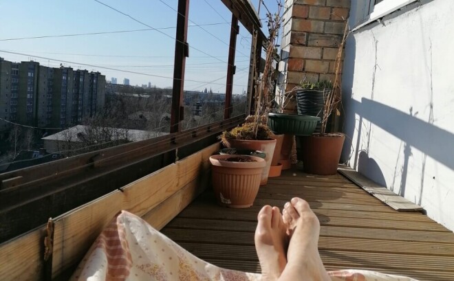 Женщина пишет, что к ней в гости приходят подруги с маленькими детьми: “Когда приходят дети в гости, надо присматривать, но вообще, очень классно смаковать кофе и смотреть вниз без препятствий. Ко мне многие подруги приходят в весенний балконный солярий".