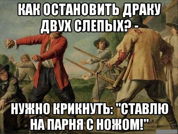 Берет мобилу, чего-то говорит. Через десять минут приезжает четыре "мерина", оттуда вываливается десять таких же братков как тот, избивают его и т.д. Он с окровавленной мордой подползает к Оке и говорит: