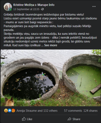 "Хочу предупредить жителей Яунмарупе об опасном месте! Пожалуйста, будьте осторожны на участке между новой детской площадкой и стадионом – нам с собакой здесь не повезло. Мы прогулялись по вышеупомянутому месту, когда вдруг собака Марли исчезла", - рассказывает Кристине.