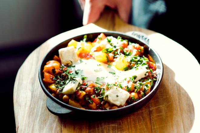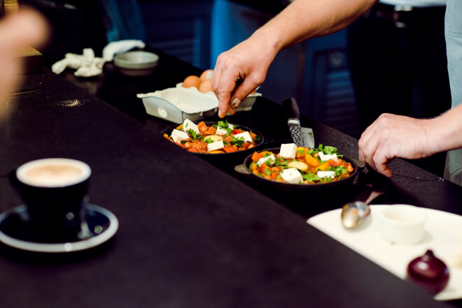 Дрейбантс порадовал гостей средиземноморским блюдом шакшука с паприкой, баклажанами, измельченной зирой, турецким горохом и фетой.