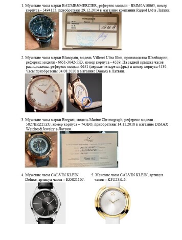 1. Мужские часы марки BAUME&MERCIER, референс модели - BMM0A10065, номер корпуса - 5494133, приобретены 29.12.2014 в магазине компании Rippol Ltd в Латвии.