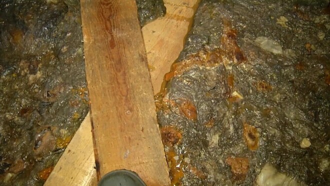 В подвале журналисты заметили разбросанные мешки, чтобы, скорее всего, остановить приток грязной жидкости. Команда передачи решилась ткнуть темную массу и подтвердила поговорку, что чем больше трогаешь дерьмо, тем больше оно воняет.