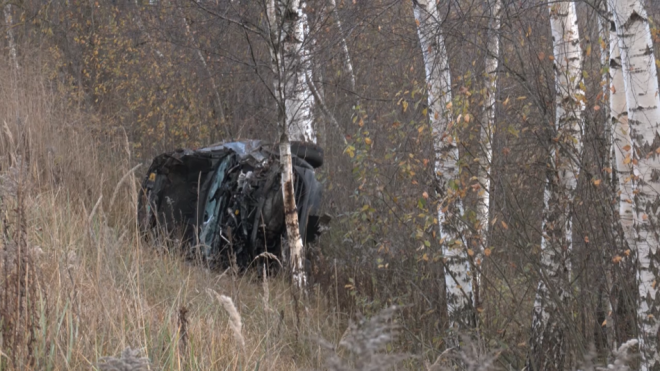 Правым боком Nissan задел кабину лесовоза Volvo. Водитель потерял контроль и съехал с дороги. Легковая машина взлетела на холм, перевернулась и остановилась, ударившись о дерево.
