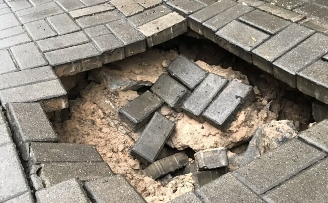 Не опять, а снова: на рижской улице Гертрудес провалилась брусчатка