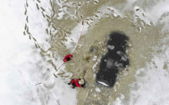 Šodien notiek ledū ielūzušas automašīnas izcelšana no ūdenstilpes Garkalnes novadā. Izsaukums uz ūdenstilpi saņemts vakarnakt, kur apmēram 300 metrus no krasta ledū ielūzusi un nogrimusi automašīna. Automašīnas vadītājs no tās izkļuvis saviem spēkiem. Foto no notikuma vietas! pic.twitter.com/wbM71OsbLg