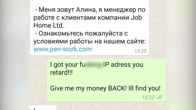"Искала возможности заработать в интернете и нашла компанию, которая предлагает работу из дома – монтировать ручки. Чтобы начать трудовые отношения, компании нужно перечислить 11 евро за услуги курьера – доставку рабочего материала. После перечисления денег эта «компания» сознательно не отвечает мне. Нет ни денег, ни ручек, ни работы", - рассказывает обманутая женщина.