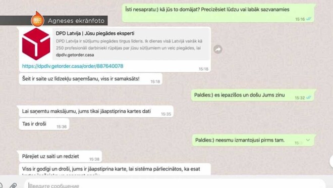 Агнесе: «В переписке в WhatasApp женщина сообщила, что проживает за пределами Риги, но готова сразу оплатить доставку и бойлер. Она предложила курьерскую службу DPD как безопасный способ оплаты. Сумма составила 350 евро.
