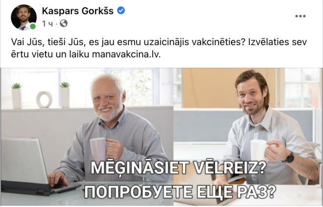 История с неудачными переводами плаката о причинах вакцинации от имени экс-футболиста Каспарса Горкшса получила продожение.