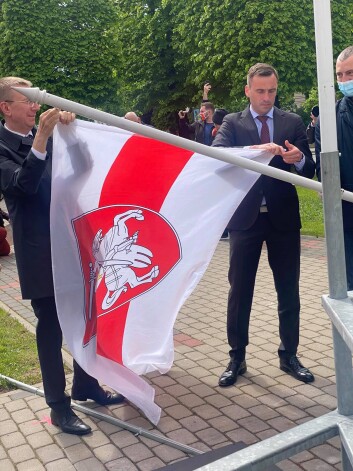 Флаг возле отеля, где проживают участвующие в чемпионате хоккеисты, в том числе белорусские, заменили министр иностранных дел Эдгар Ринкевич и председатель Рижской думы Мартиньш Стакис.