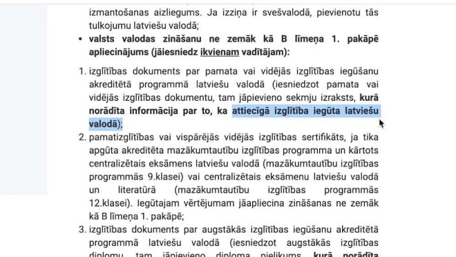 Например: действительно ли люди, получившие образование за границей, но говорящие на латышском языке, должны сдавать языковой сертификат (B1), который основан на постановлениях Кабинета министров? Действительно ли мы живем в стране, где латыш, чтобы работать водителем такси, должен дополнительно предоставить документ, на каком языке получено соответствующее образование, когда одновременно в правительстве Латвии есть лица, получившие образование за рубежом? Получается, что таксистами в Латвии они работать не могут или тоже нужно проходить соответствующие курсы государственного языка ???