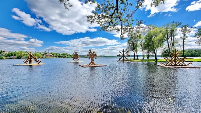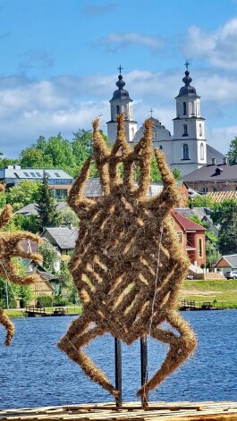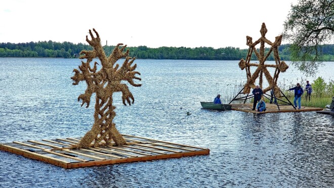 На плотах на озере Зарасас красуются пять скульптур из самого что ни на есть природного материала. Над созданием работ трудились профессиональные литовские скульпторы. Как и картин, у каждой из пяти фигур есть свое название. Здесь есть и «Эгле – королева зелени», и «Богиня возрождения», и «Солнце»... На каждую из них ушло около 200 килограммов соломы, высота статуй составляет от четырех до шести метров.